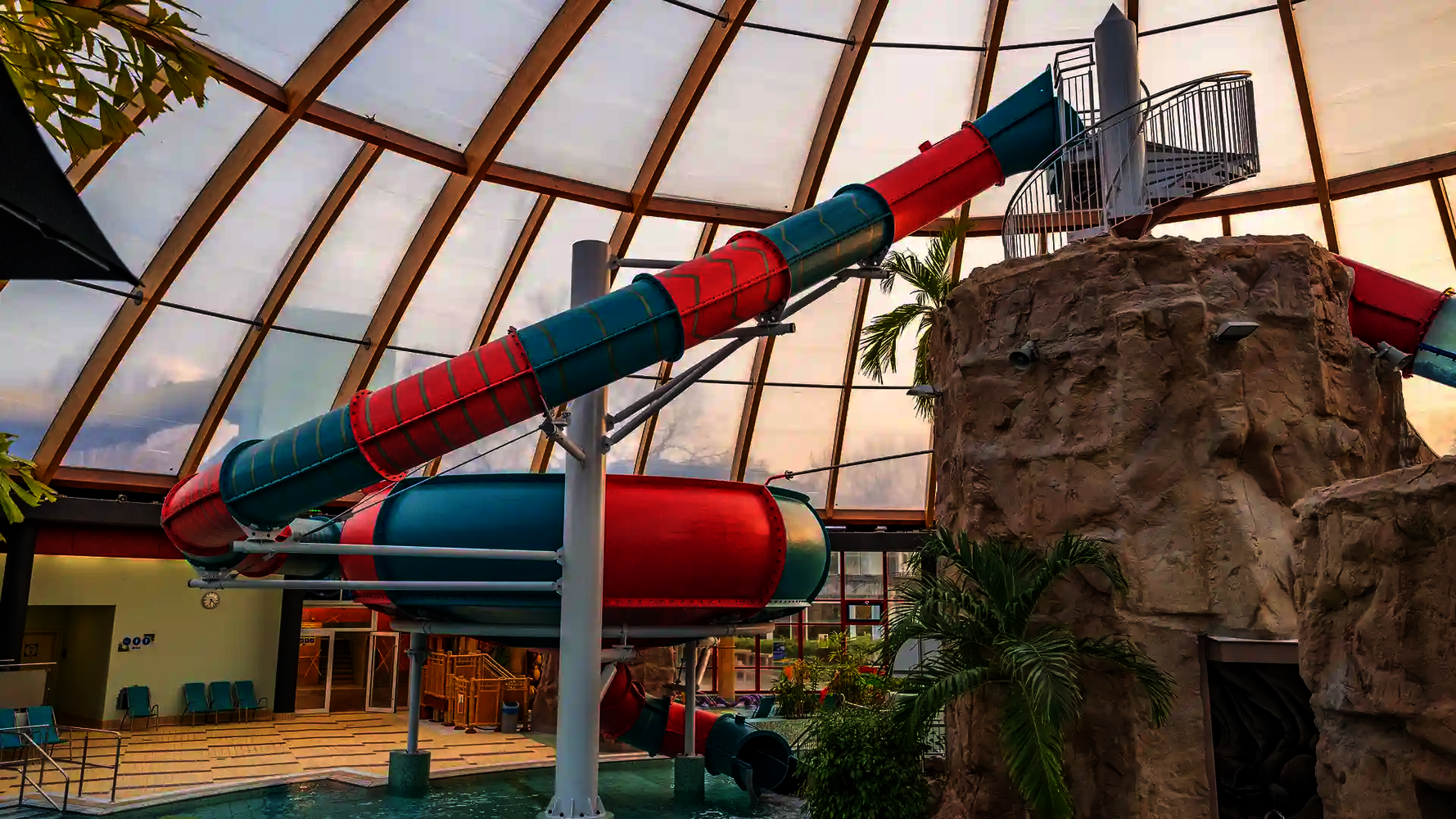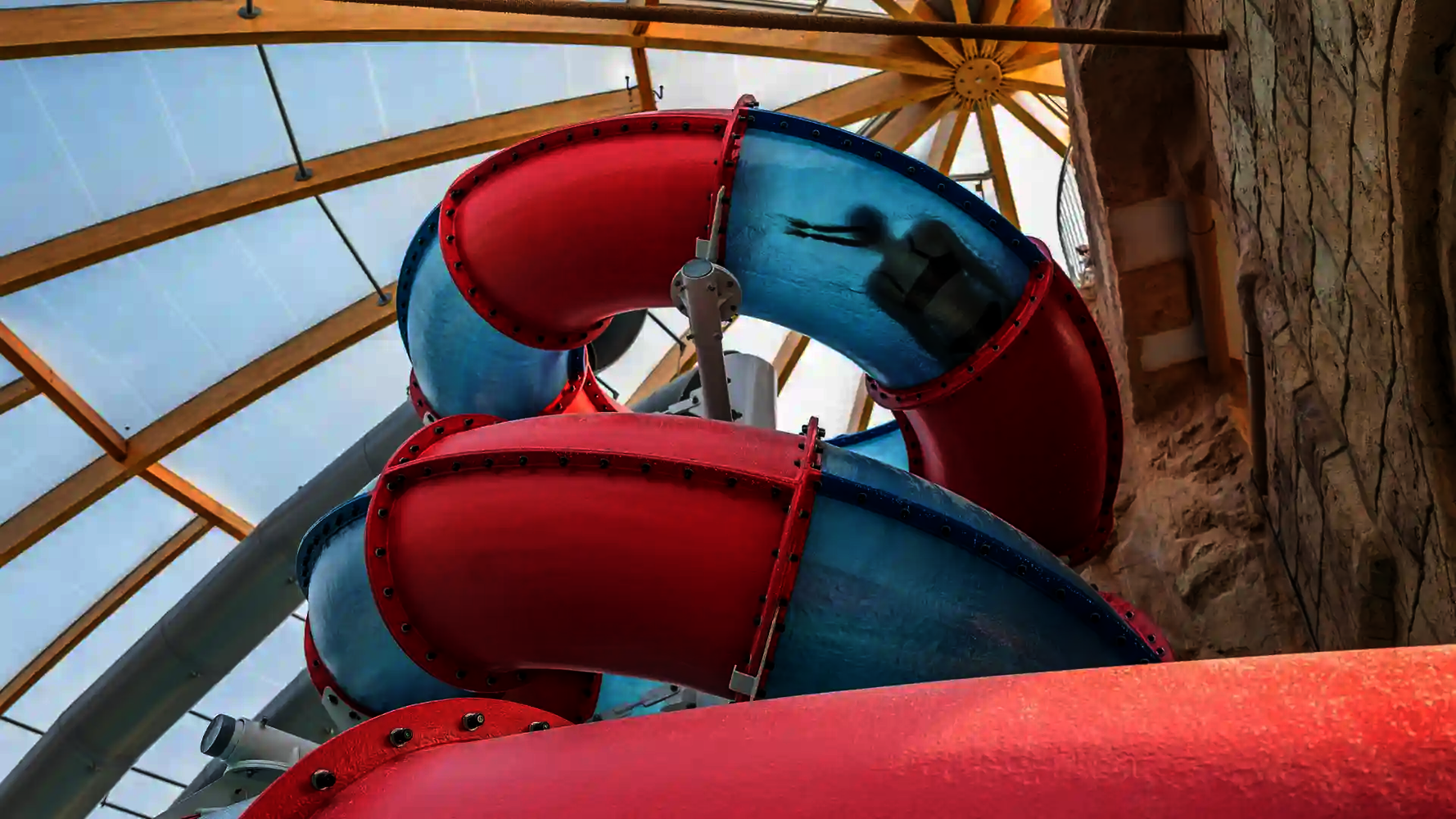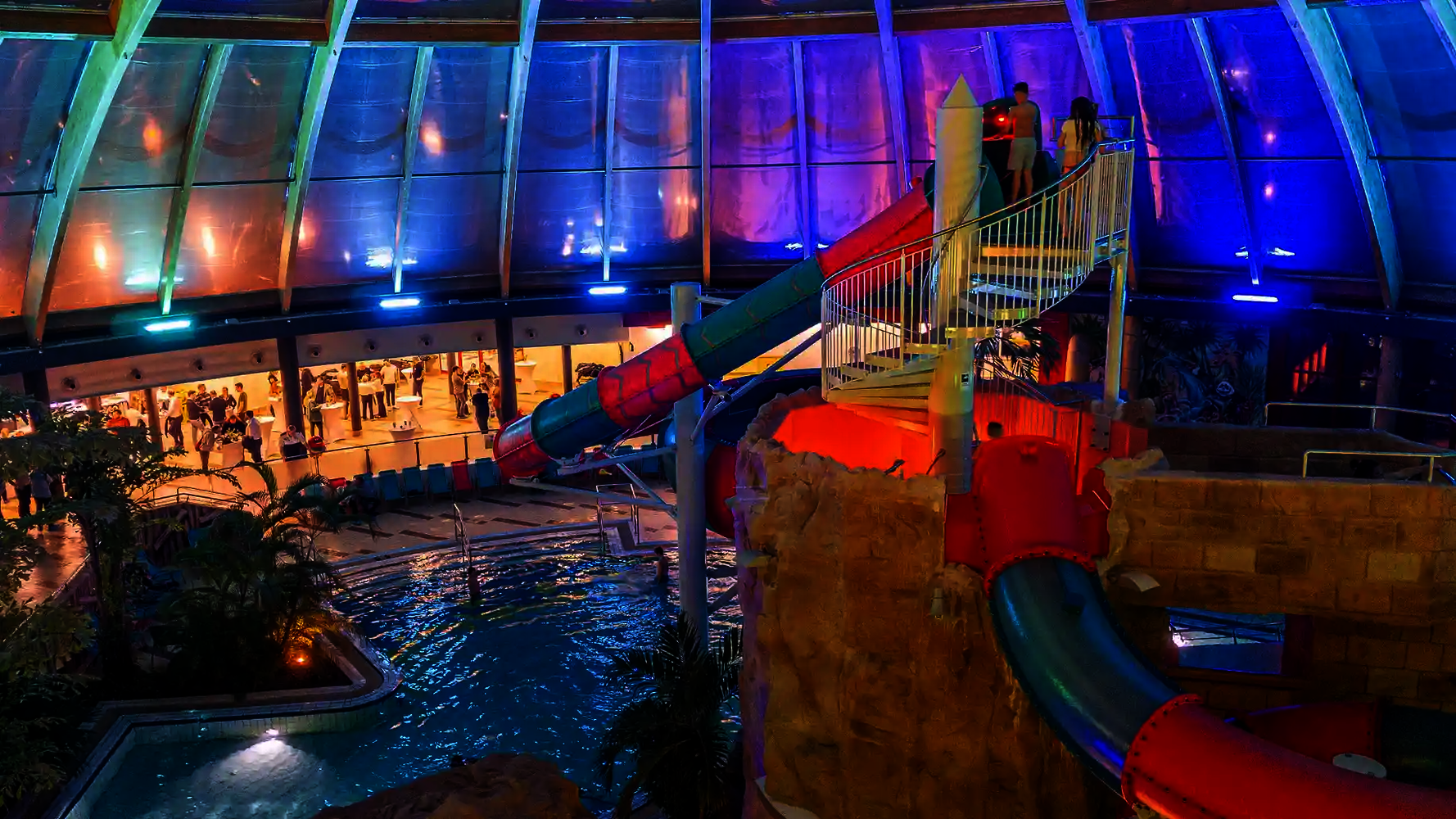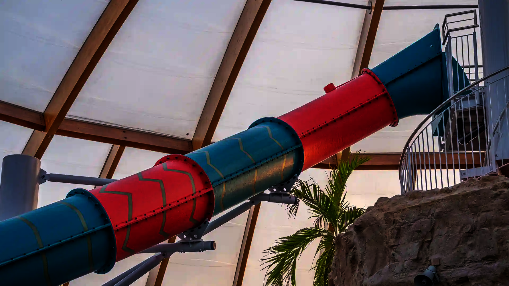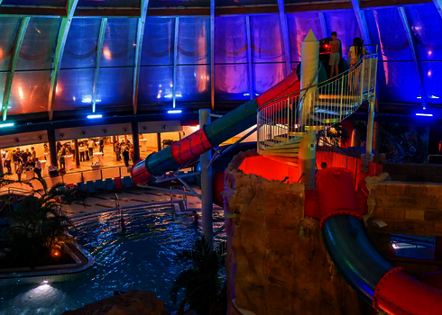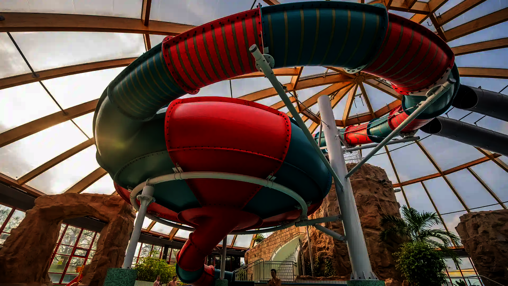 Most of the water slides in the Tropical Islands near Berlin were planned and implemented by us. Thanks to our experience in building indoor water attractions, we were able to create a varied slide experience in a limited space. The slides blend seamlessly into the tropical environment and offer their visitors an unforgettable experience.