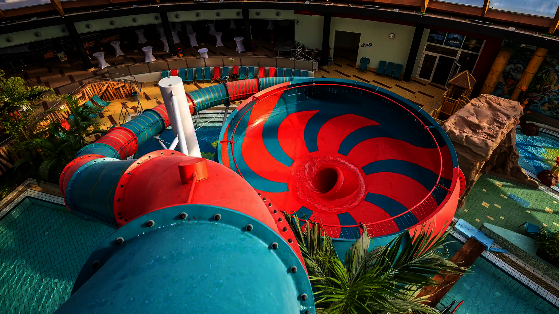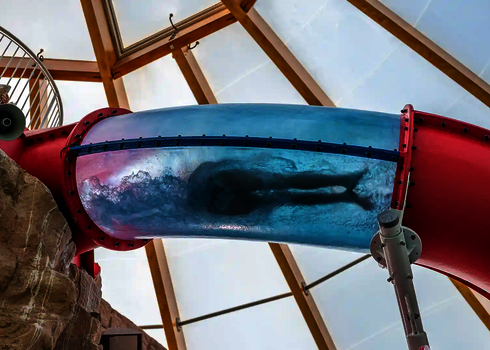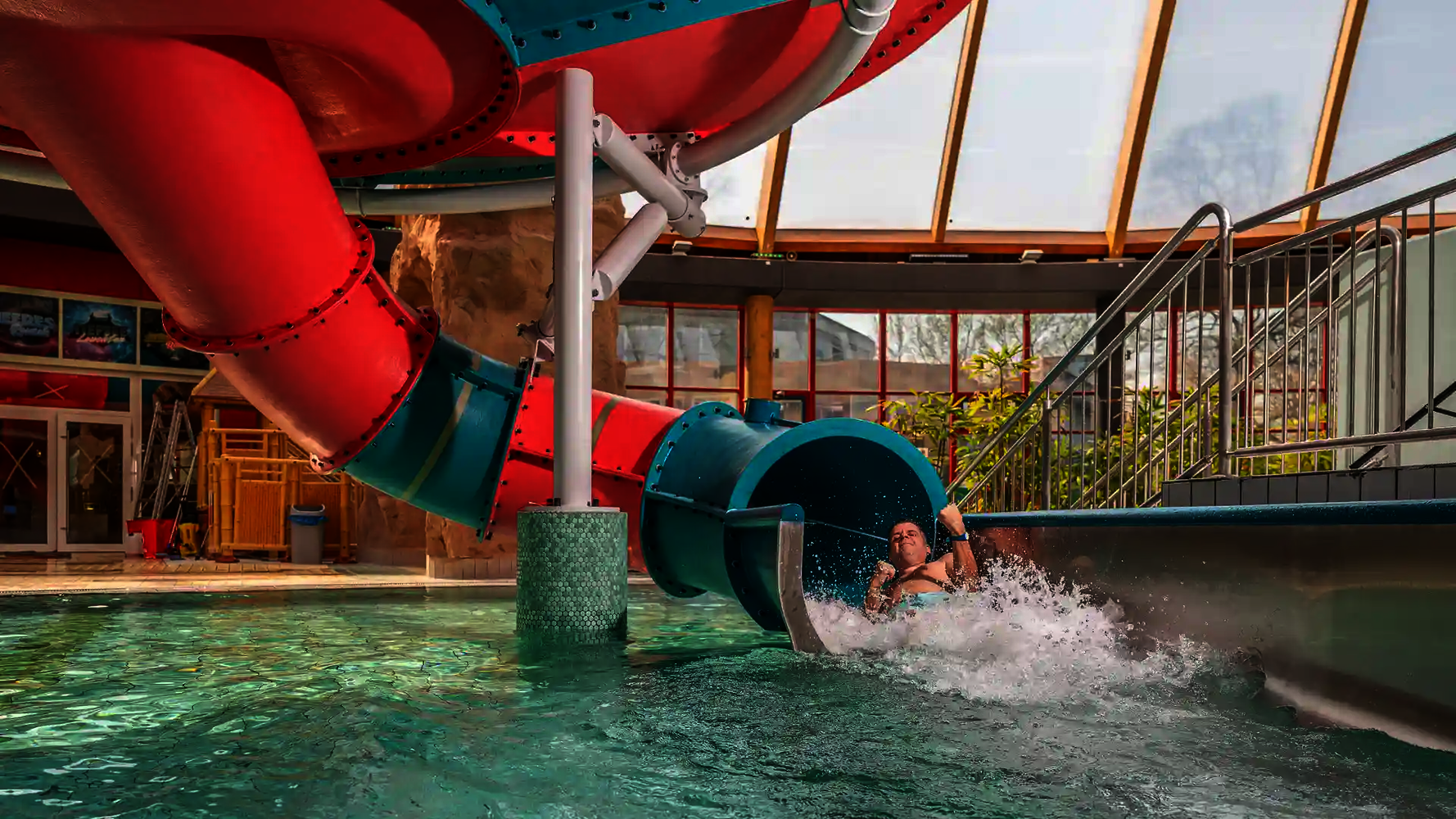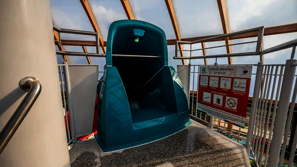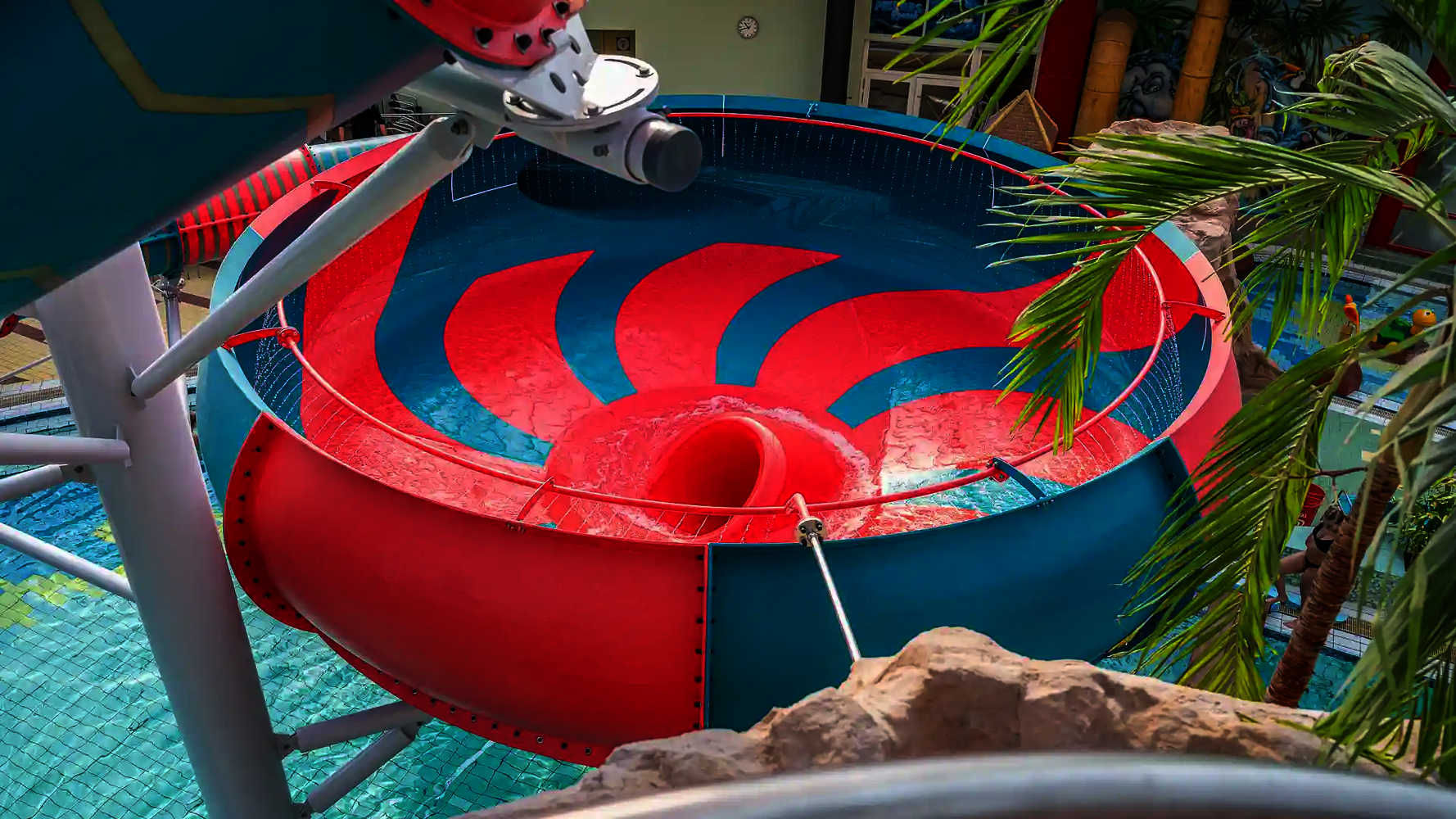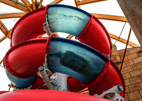 The second attraction is the RR900, which is called the "Coral Swirl" in the pool. The compact, dynamic tube slide with narrow lines ensures continuous acceleration and an intense ride experience in a comparatively small space. Both slides were newly constructed as part of the modernization and integrated directly into the existing indoor swimming pool, thereby expanding the range of slides at Atlantis Dorsten.