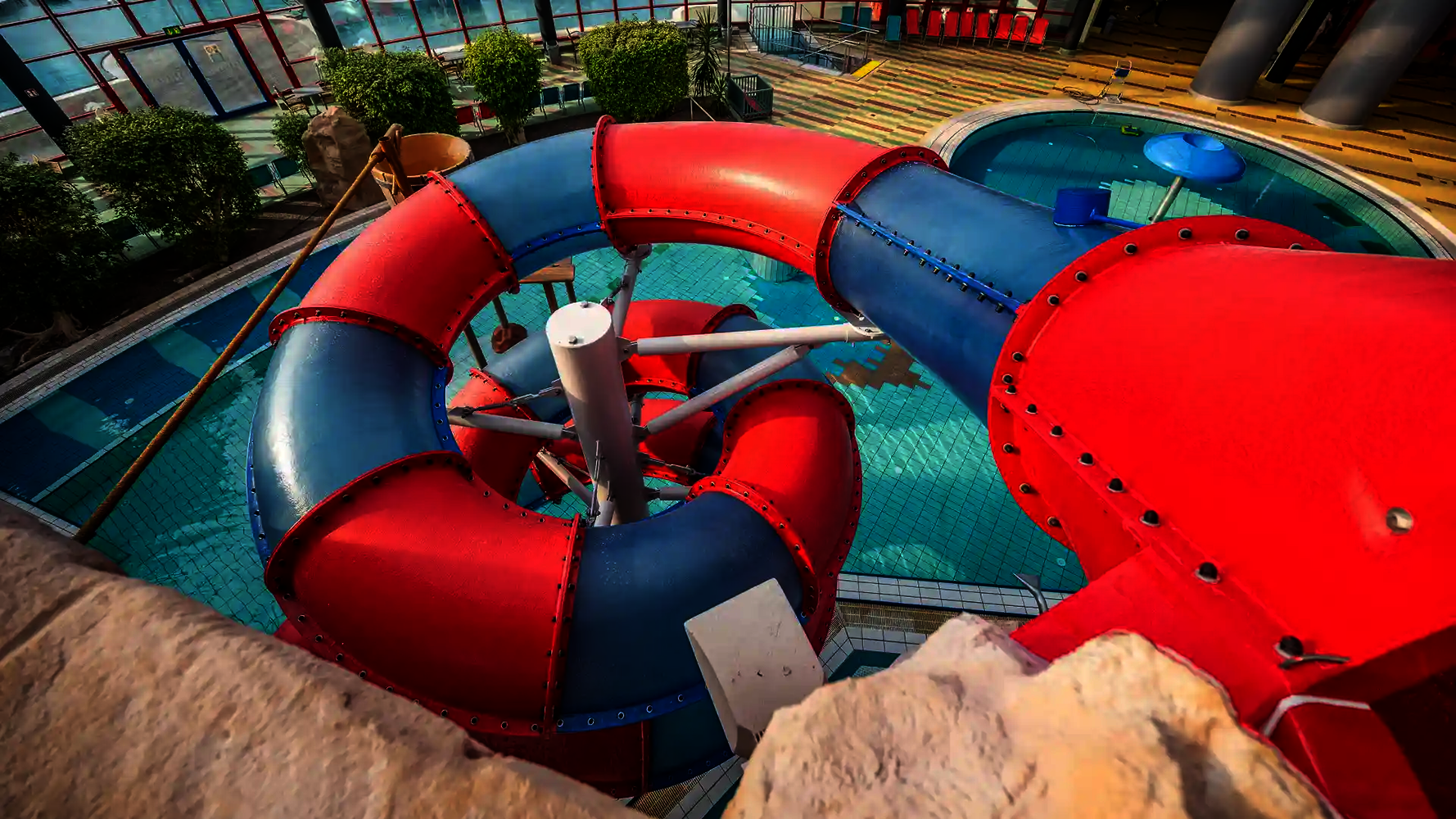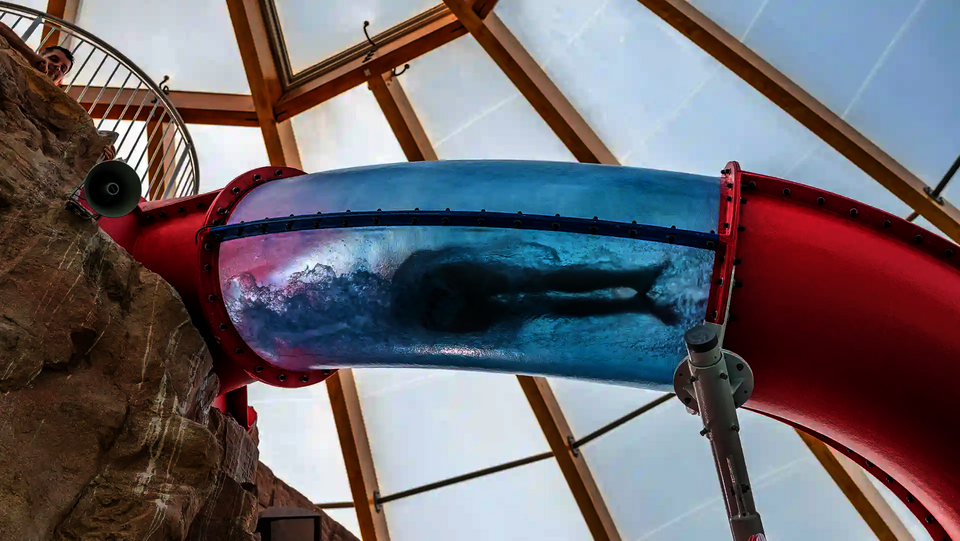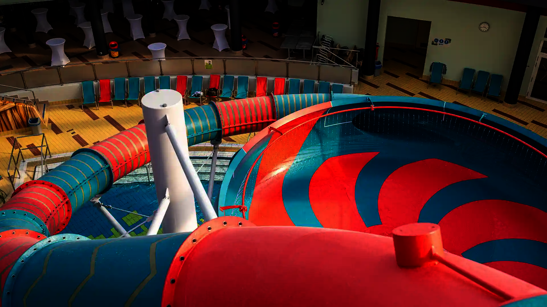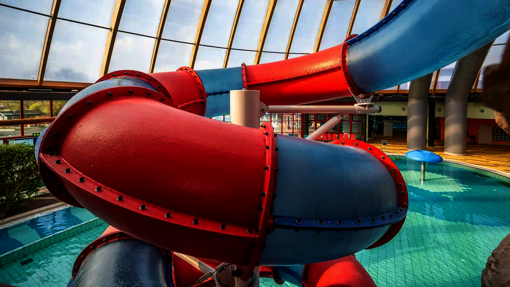 The second attraction is the RR900, which is called the "Coral Swirl" in the pool. The compact, dynamic tube slide with narrow lines ensures continuous acceleration and an intense ride experience in a comparatively small space. Both slides were newly constructed as part of the modernization and integrated directly into the existing indoor swimming pool, thereby expanding the range of slides at Atlantis Dorsten.