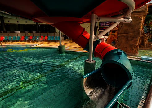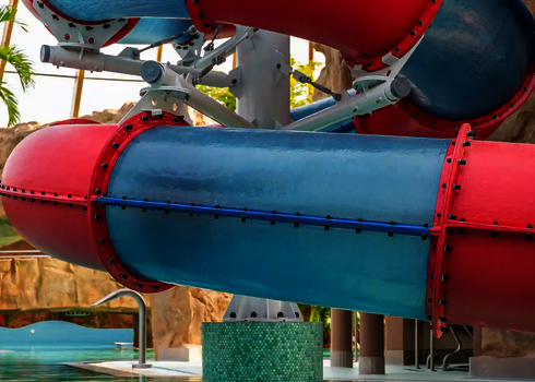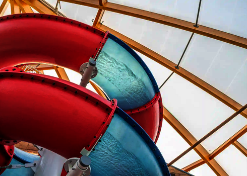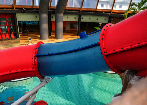 For the use on cruise ships, we develop tailor-made water slides meeting the special requirements on board. An example of this type of cruise ships is the AIDA PRIMA, which is equipped with a 96-meter-long Body Racer made of stainless steel and acrylic glass tubes, as well as a 54-meter-long Lazy River. Two tire slides with lengths of 79 metres and 80 metres as well as a 77 metre long family slide were installed on the cruise ship AIDA NOVA. Our slides are designed to meet the limited space and safety standards on cruise ships while providing an exciting slide experience for guests.