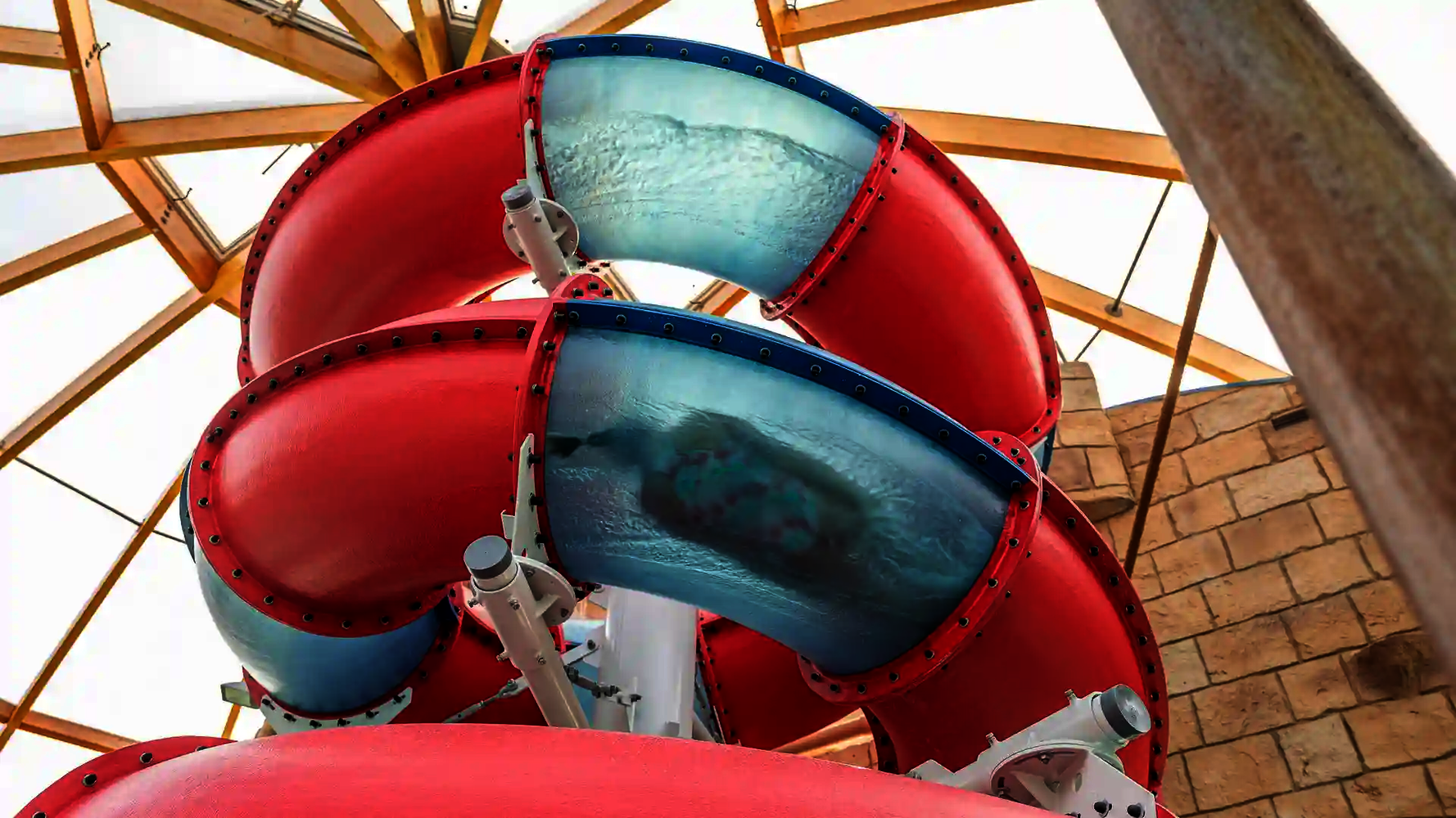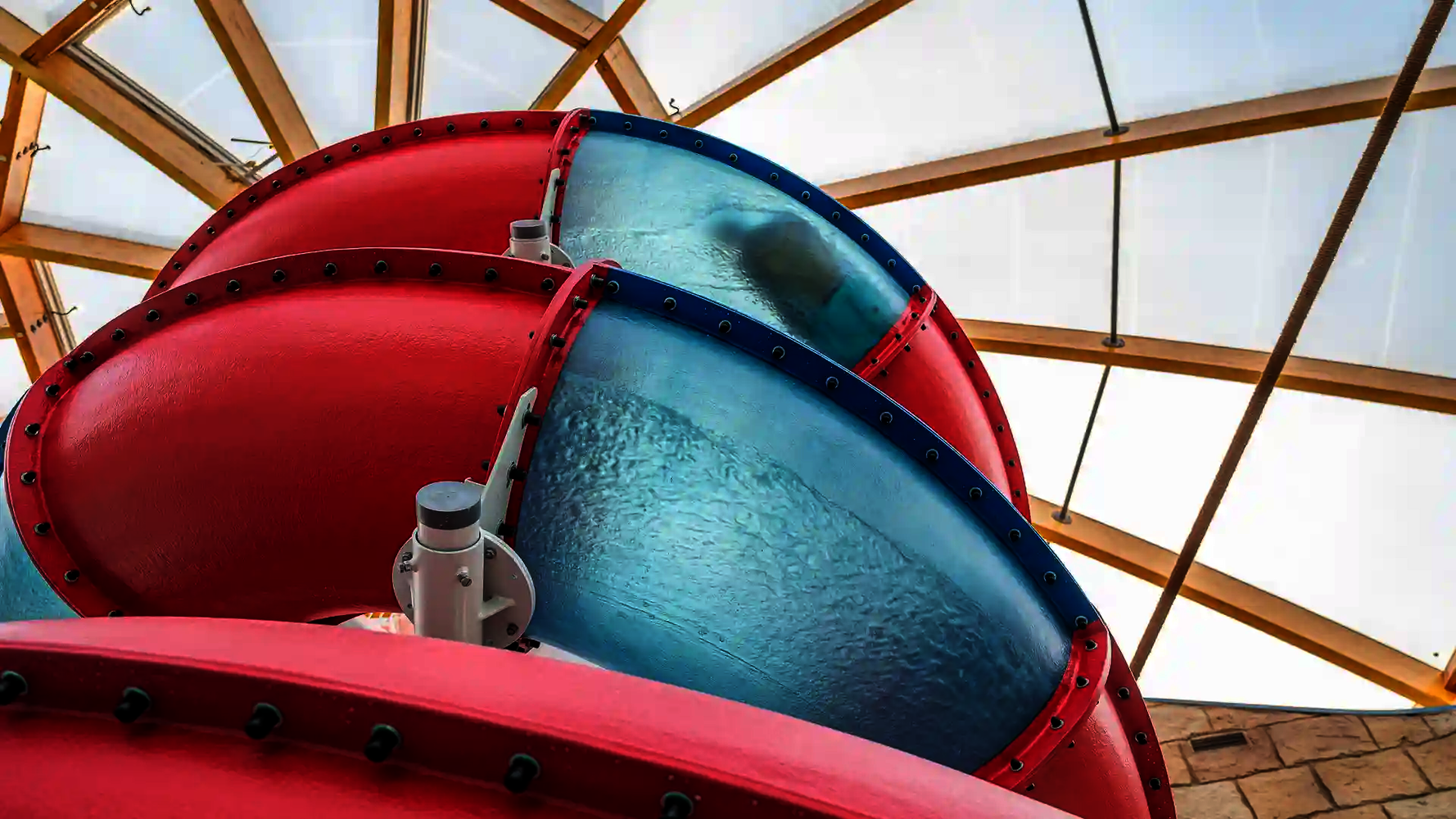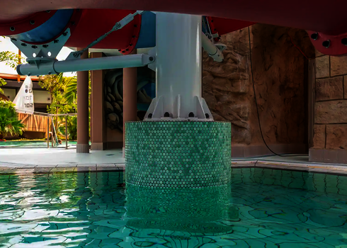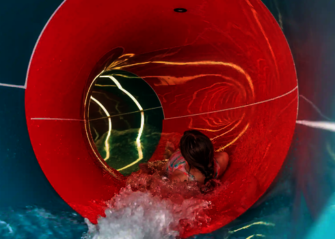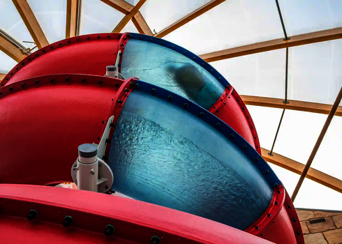 Our longest water slide is located in the Ocean Adventure water park in South Korea. It is a three-lane Matracer made of stainless steel and reaching an impressive length of 103 meters. This slide offers its guests an exciting and memorable experience.