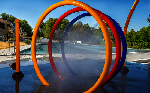 The combination of dynamic water play and robust stainless steel design makes a visit to the outdoor pool an experience for all age groups.