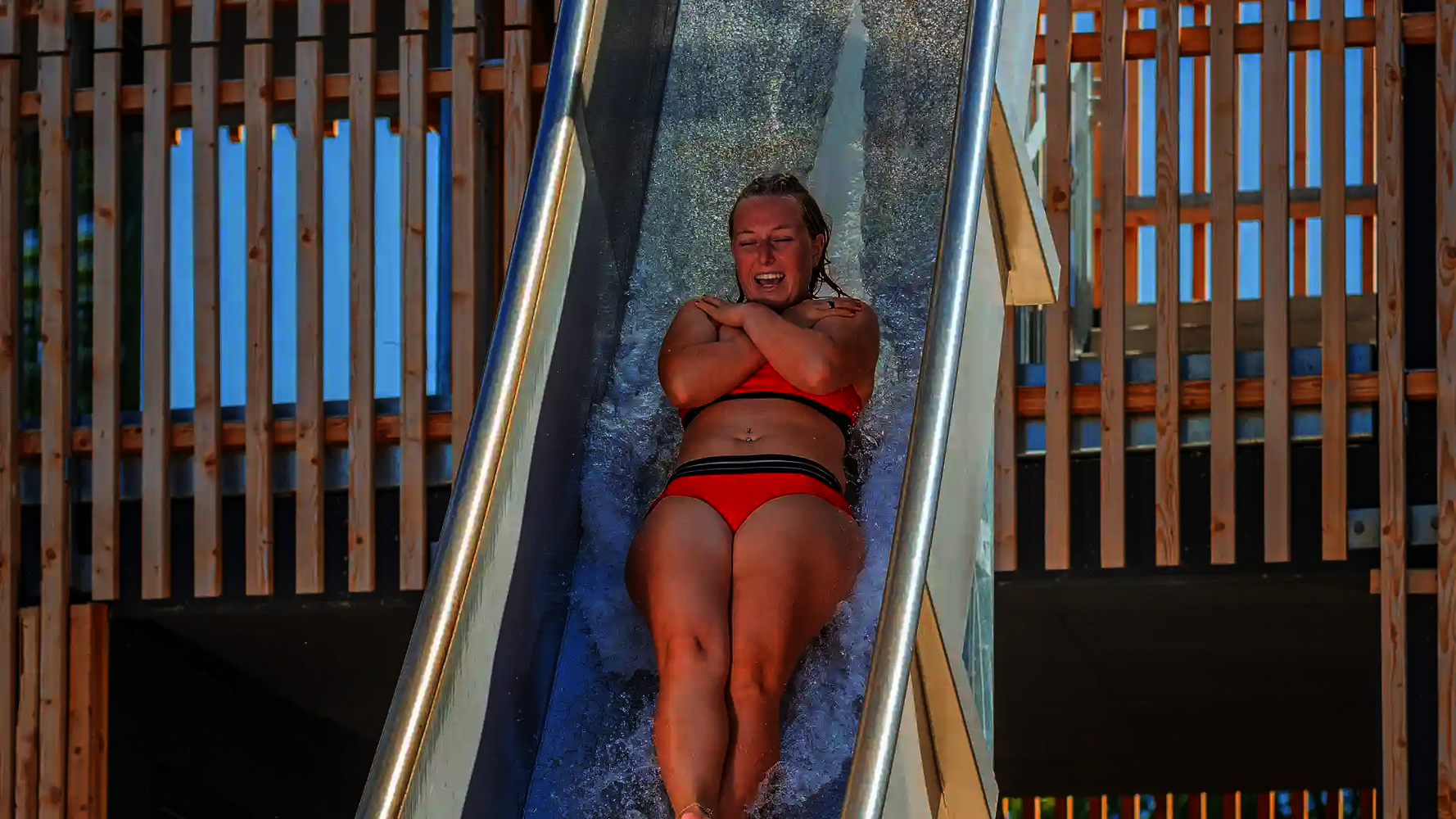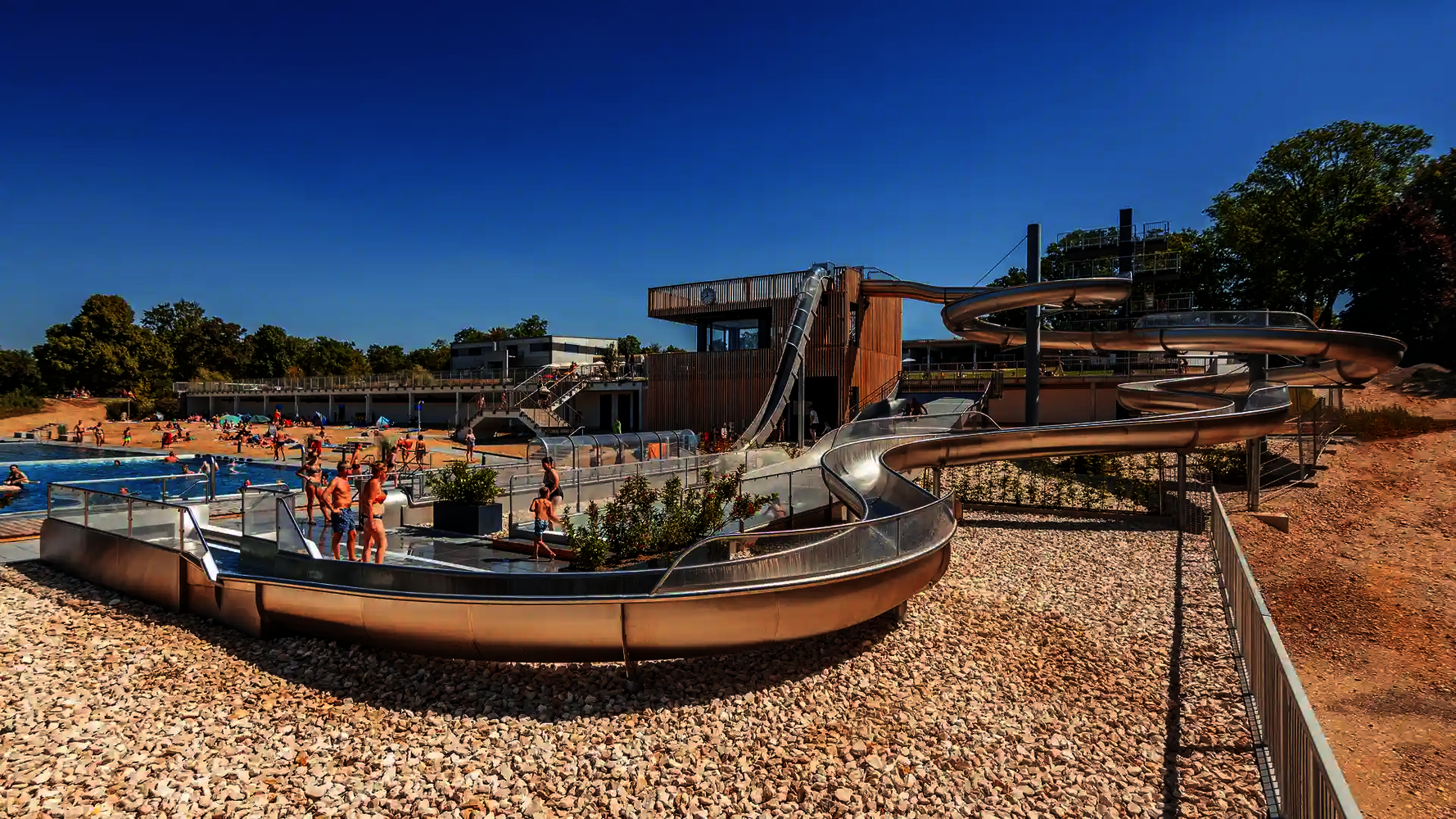 The Schellenberg outdoor pool offers a wide range of slides for plenty of variety. The WR1040 stainless steel slide, a steep free-fall slide and a wide wave slide offer action for young and old.