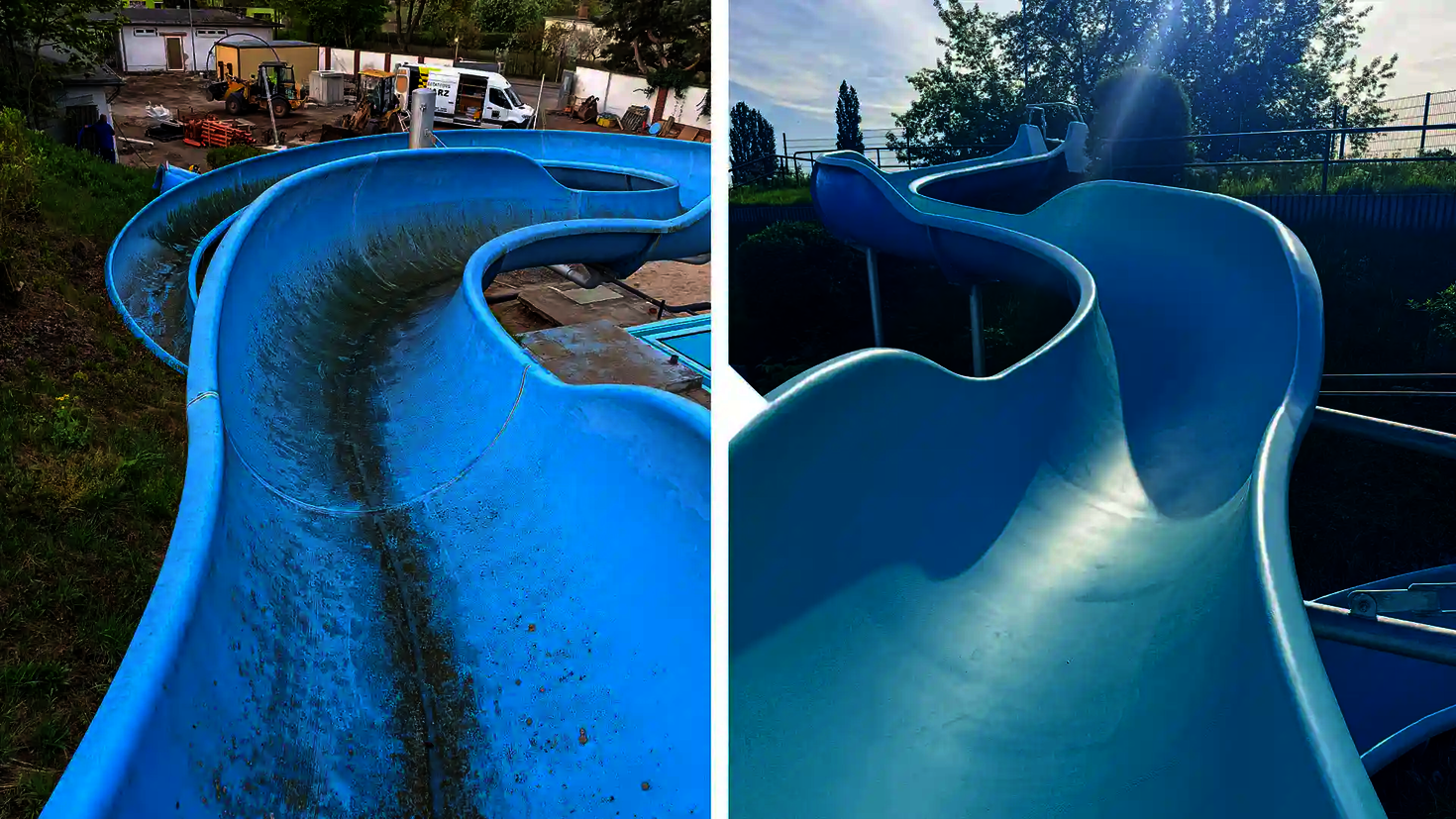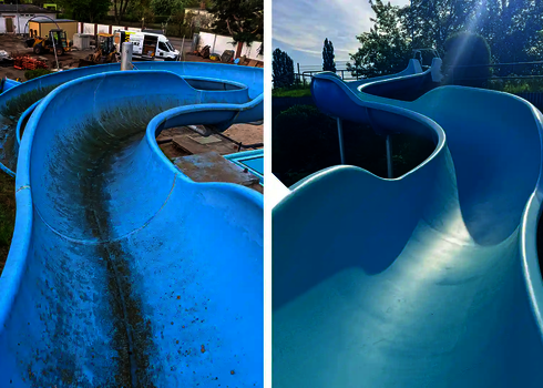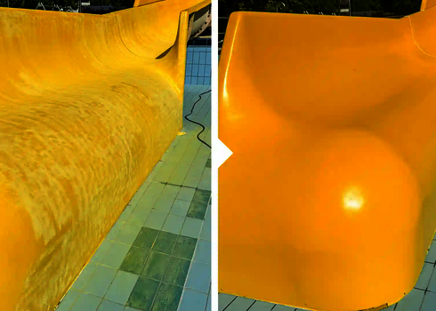 The regular Cleaning of FRP (glass fibre reinforced plastic) slides is essential for their durability and safety. Our Service - Team offers professional cleaning services for your slides, both indoors and outdoors. Damaged areas are polished and the slides are thoroughly cleaned, especially before commissioning at the beginning of the season. For optimal care, we recommend carrying out these cleaning measures on a regular basis.