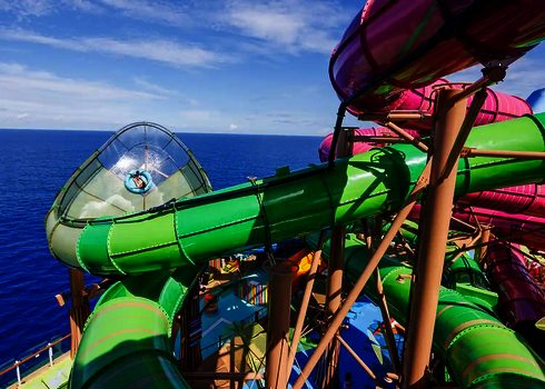 For the use on cruise ships, we develop tailor-made water slides meeting the special requirements on board. An example of this type of cruise ships is the AIDA PRIMA, which is equipped with a 96-meter-long Body Racer made of stainless steel and acrylic glass tubes, as well as a 54-meter-long Lazy River. Two tire slides with lengths of 79 metres and 80 metres as well as a 77 metre long family slide were installed on the cruise ship AIDA NOVA. Our slides are designed to meet the limited space and safety standards on cruise ships while providing an exciting slide experience for guests.