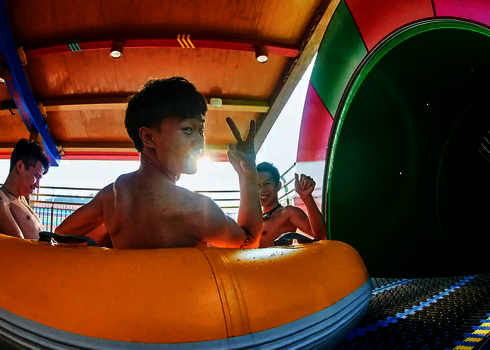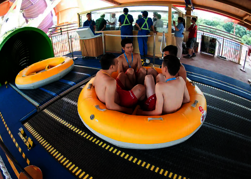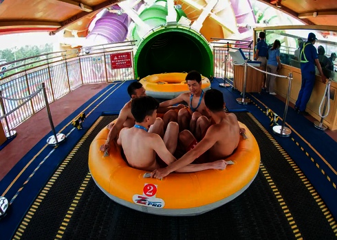 Only normal swimwear such as swimming trunks, swimsuits or bikinis are permitted on water slides. This is for your safety and protects the slide.