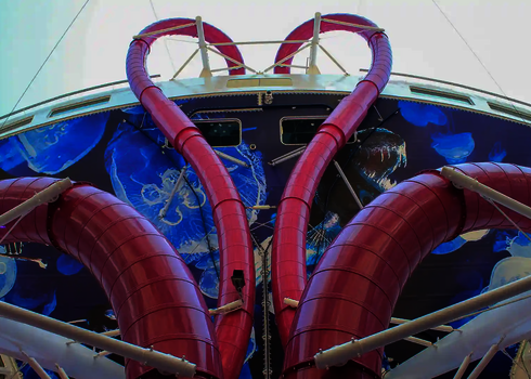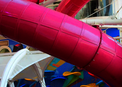 For the use on cruise ships, we develop tailor-made water slides meeting the special requirements on board. An example of this type of cruise ships is the AIDA PRIMA, which is equipped with a 96-meter-long Body Racer made of stainless steel and acrylic glass tubes, as well as a 54-meter-long Lazy River. Two tire slides with lengths of 79 metres and 80 metres as well as a 77 metre long family slide were installed on the cruise ship AIDA NOVA. Our slides are designed to meet the limited space and safety standards on cruise ships while providing an exciting slide experience for guests.