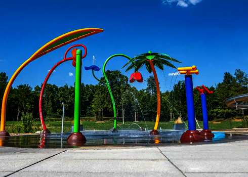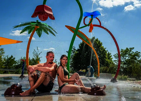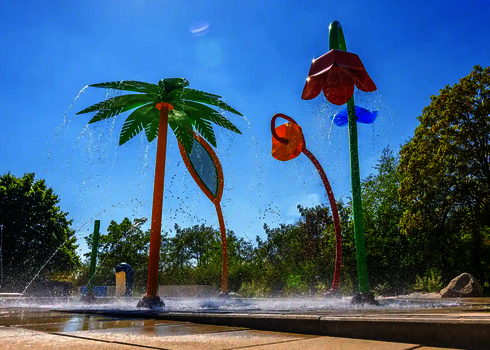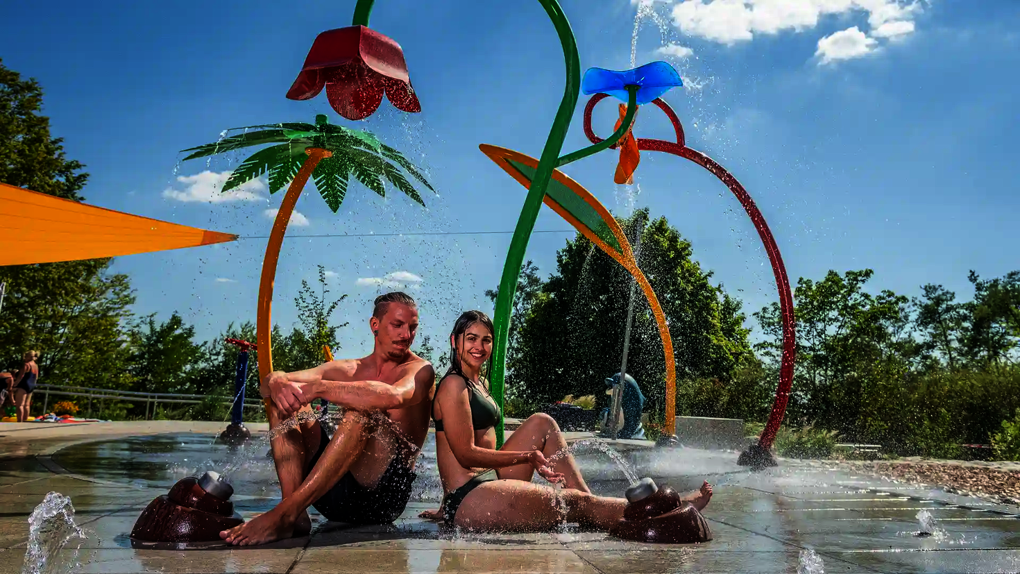The outdoor swimming pool Bad am Berg in Kösching has been comprehensively modernised and has since offered an attractive range of water games for all ages. The focus of the newly designed children's area is an individually selected selection of Wie-Spray elements: a Flower, a Banana Leaf, a Palm Tree, as well as Double Cannons and other components invite you to play, discover and refresh, all on a level, barrier-free surface without a pool.
