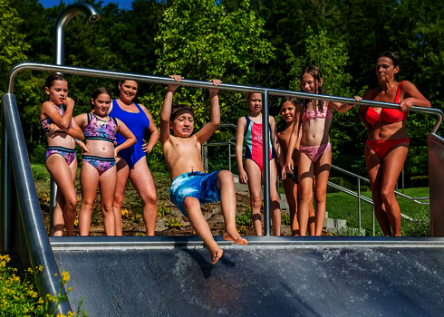 Two stainless steel slides await large and small bathers in the forest swimming pool of Goldbach. The WR1040 model impresses with its curved course and smooth sliding experience, while the Family Slide is a highlight, especially for families and children. Both slides blend harmoniously into the green surroundings of the forest swimming pool by offering long-lasting swimming fun in all weather conditions.