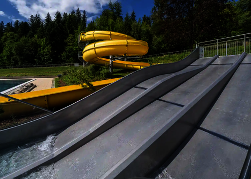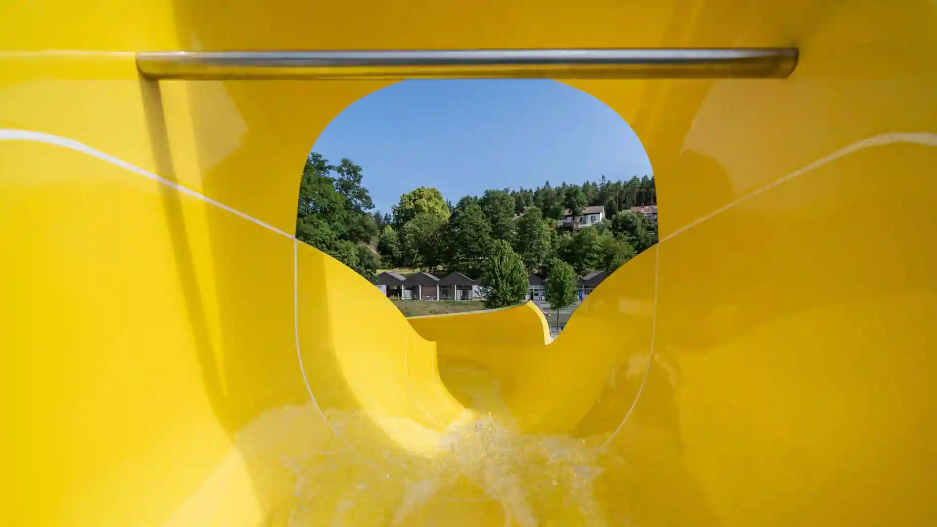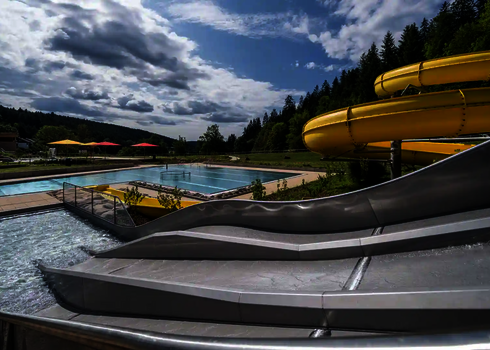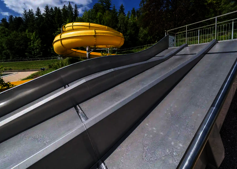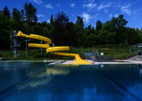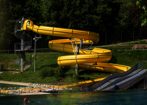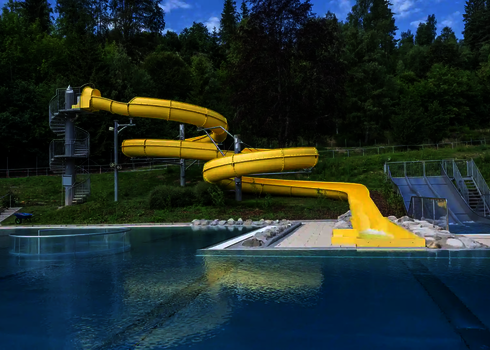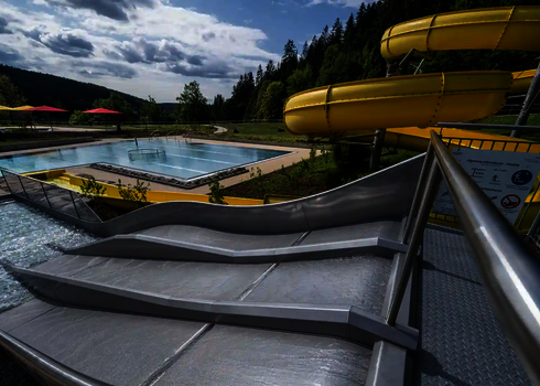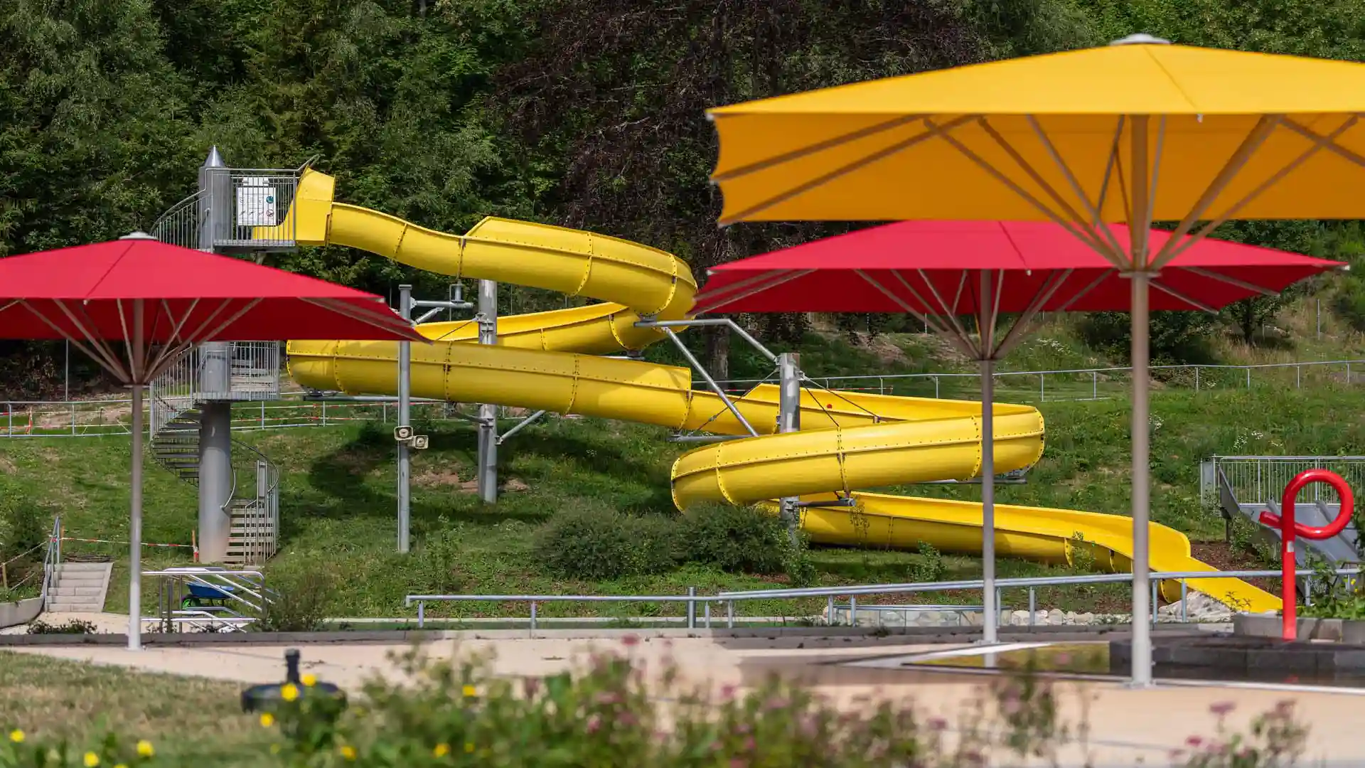 The Badschnass outdoor swimming pool in Tennenbronn offers a wide range of slides for family-friendly water fun. The highlight is the yellow WR1040 made of FRP with a length of 73 meters, which ensures a safe and fun ride with its curved course. The offer is complemented by a stainless steel Trio-Slide with three parallel lanes and a children's slide, which is specially designed to meet the needs of the youngest guests.