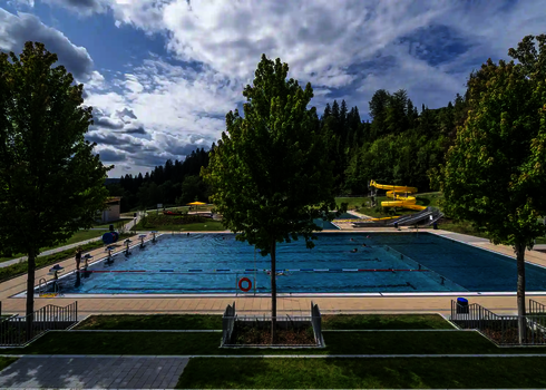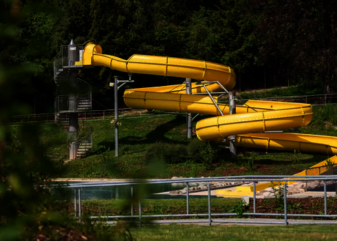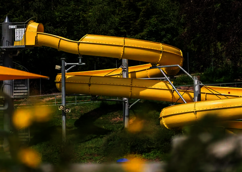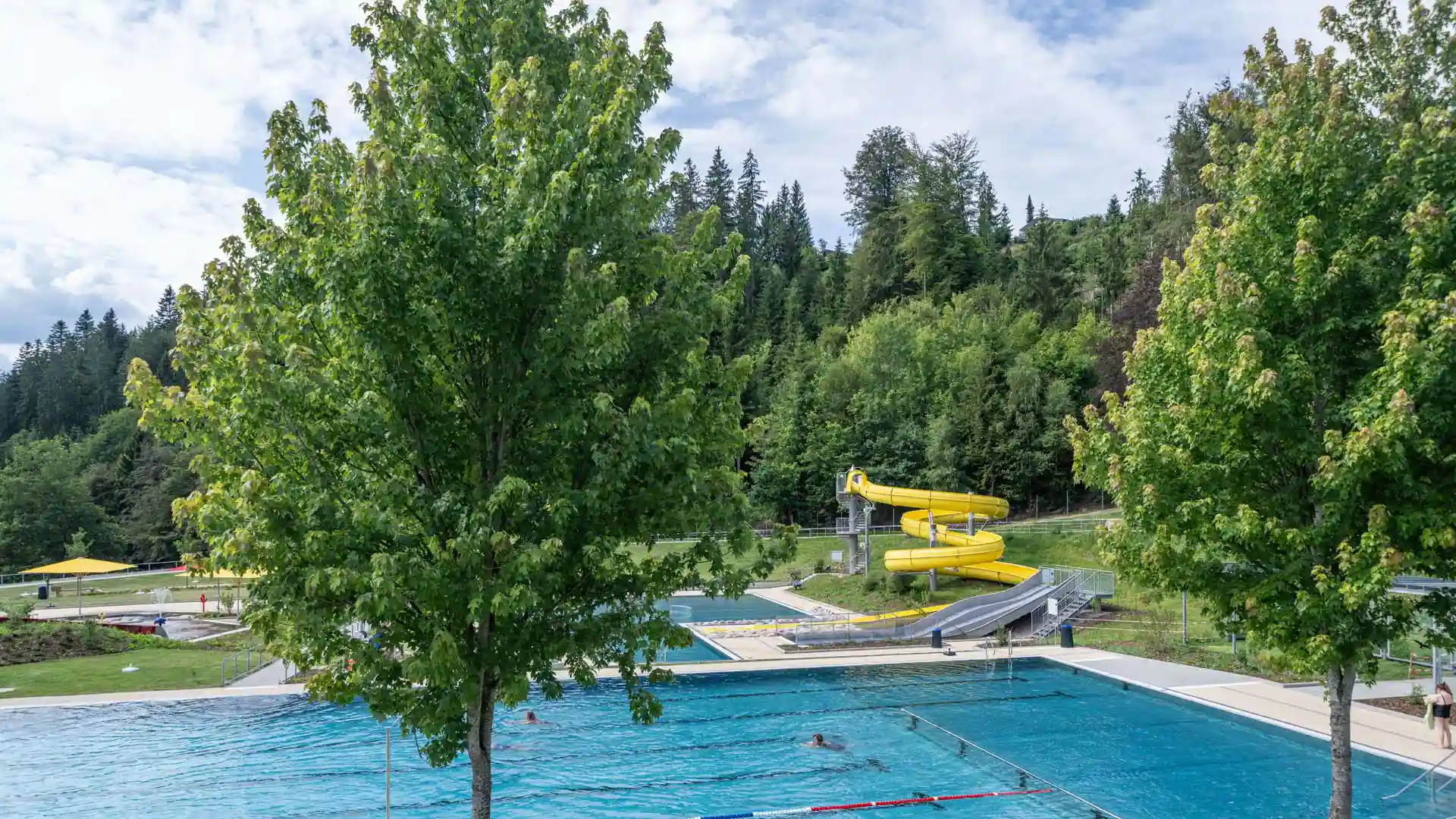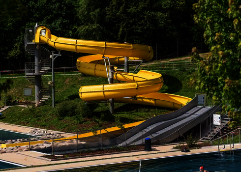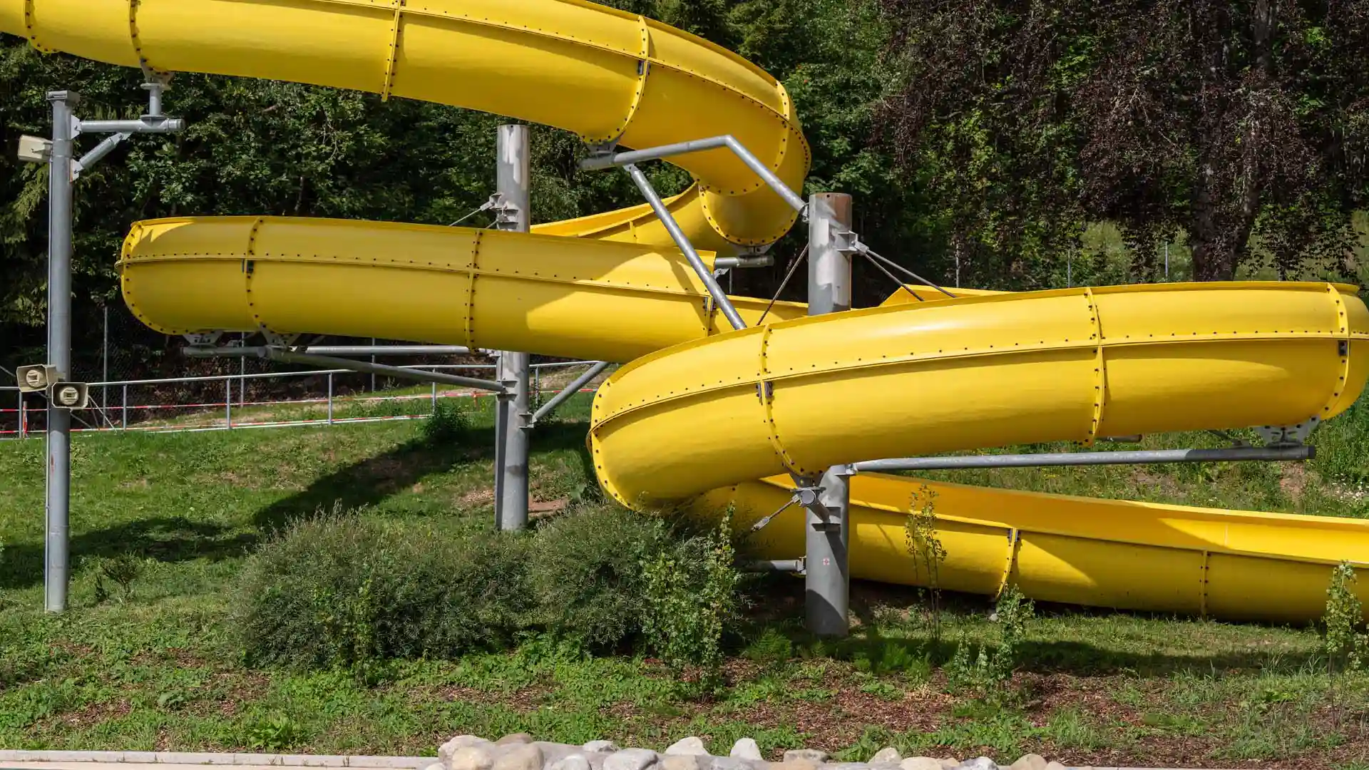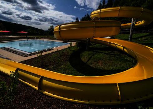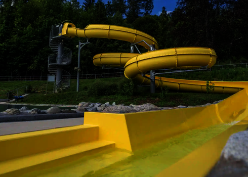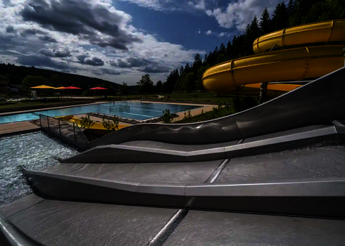The Badschnass outdoor swimming pool in Tennenbronn offers a wide range of slides for family-friendly water fun. The highlight is the yellow WR1040 made of FRP with a length of 73 meters, which ensures a safe and fun ride with its curved course. The offer is complemented by a stainless steel Trio-Slide with three parallel lanes and a children's slide, which is specially designed to meet the needs of the youngest guests.