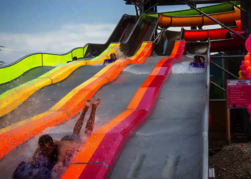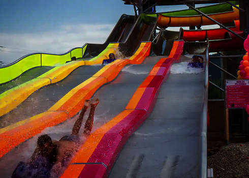 Our longest water slide is located in the Ocean Adventure water park in South Korea. It is a three-lane Matracer made of stainless steel and reaching an impressive length of 103 meters. This slide offers its guests an exciting and memorable experience.