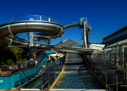 Our longest water slide is located in the Ocean Adventure water park in South Korea. It is a three-lane Matracer made of stainless steel and reaching an impressive length of 103 meters. This slide offers its guests an exciting and memorable experience.