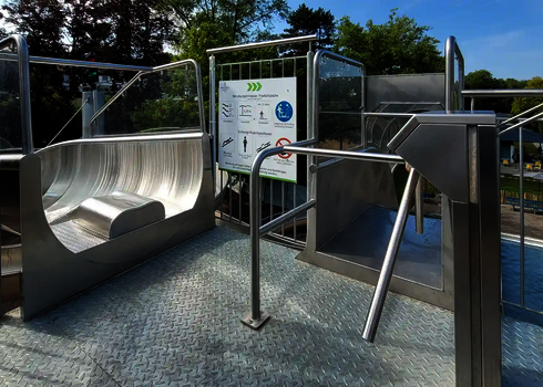 Les toboggans en acier inoxydable sont entièrement recyclables. Les toboggans en PRV peuvent être partiellement recyclés ou éliminés dans les règles de l'art. Lors du remplacement ou de la modernisation, nous veillons à une élimination respectueuse de l'environnement.