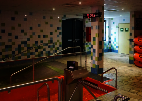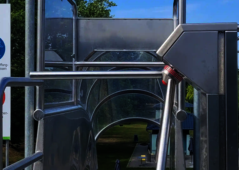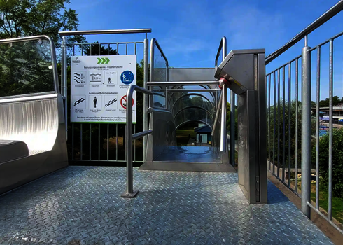 Pour les toboggans à forte fréquentation et nécessitant une sécurité accrue : le système d'accès sécurisé par tourniquet garantit qu'une seule personne par toboggan accède à la zone de départ. Ce système mécaniquement robuste et à commande électronique est particulièrement adapté aux toboggans à grande vitesse, aux toboggans de course ou aux toboggans à forte affluence. Le système a été largement testé dans des conditions d'exploitation réelles et est utilisé dans de nombreux parcs aquatiques et parcs d'attractions dans le monde entier. Un démarrage involontaire ou prématuré est exclu de manière fiable - même dans des zones de départ sans visibilité ou avec une visibilité réduite.