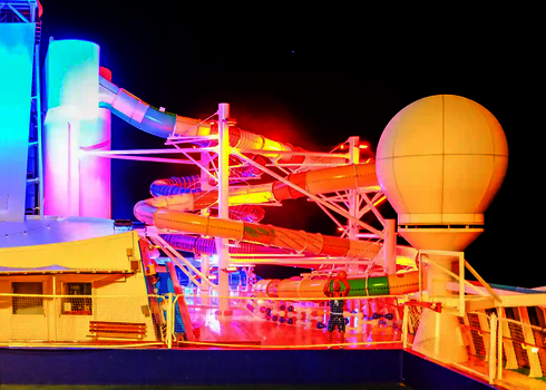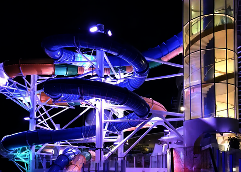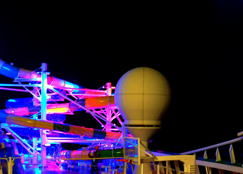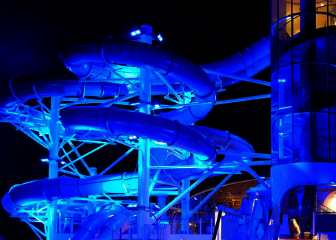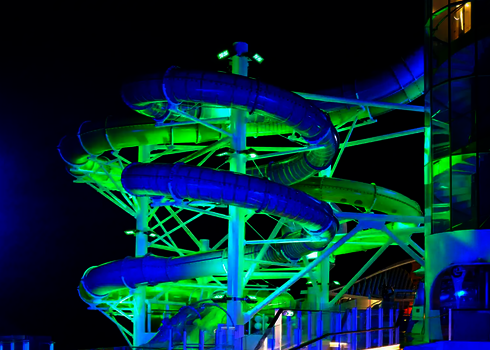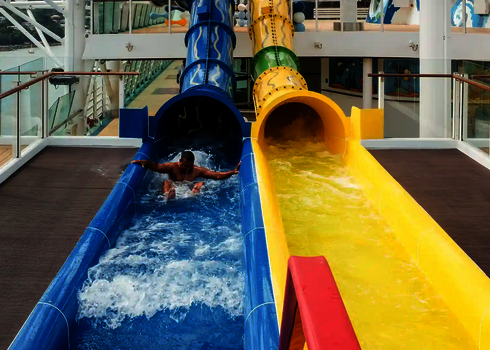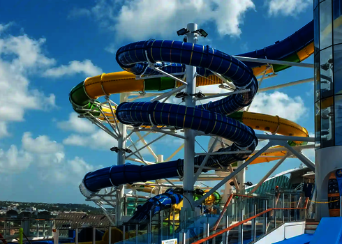 Sur l'Adventure of the Seas de Royal Caribbean, un RR900 assure les plaisirs de la glisse sur le pont. L'installation en extérieur est complétée par un feu de signalisation de départ, un bassin de réception sécurisé et des éléments acryliques transparents. Des supports et des structures en acier stables garantissent une sécurité maximale, quelle que soit la position de la mer. Le toboggan offre une expérience de loisirs particulière en haute mer.