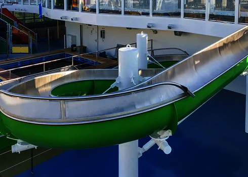Pour l'utilisation sur les navires de croisière, nous développons des toboggans aquatiques sur mesure qui répondent aux exigences particulières à bord. C'est le cas par exemple de l'AIDA PRIMA, qui est équipé d'un Body Racer de 96 mètres en acier inoxydable et de tubes en verre acrylique, ainsi que d'un Lazy River de 54 mètres. Sur l'AIDA NOVA, deux toboggans à bouées de 79 mètres et 80 mètres de long ont été installés, ainsi qu'un Family Slide de 77 mètres. Nos toboggans sont conçus pour s'adapter à l'espace limité et aux normes de sécurité des navires de croisière, tout en offrant aux passagers une expérience de glisse passionnante.