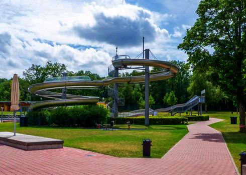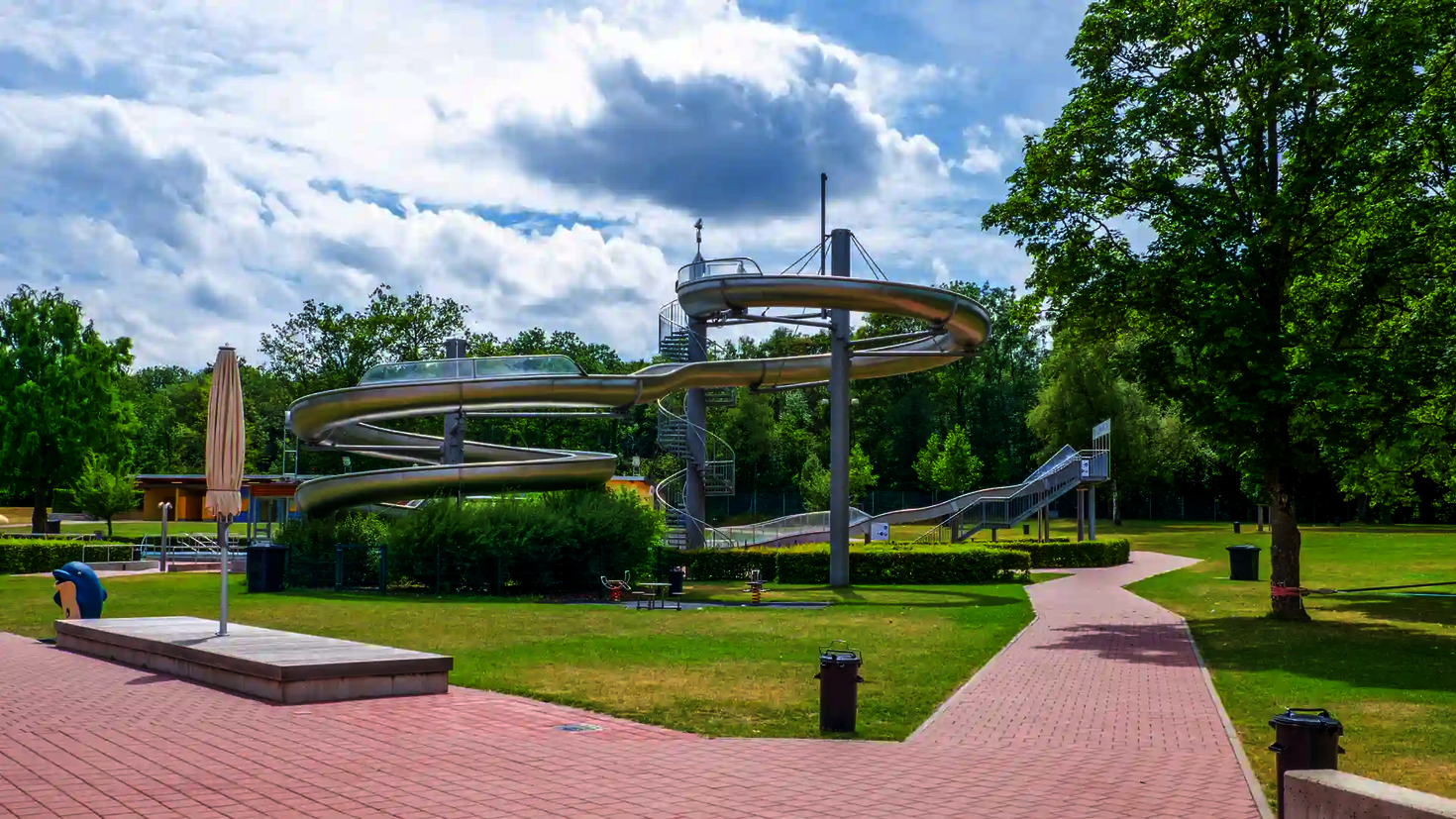 Dans la piscine en plein air très appréciée d'Ingolstadt, les baigneurs peuvent s'attendre, outre à de vastes zones de bassins et à de vastes pelouses, à un véritable point fort de notre maison : le toboggan aquatique WR1040.